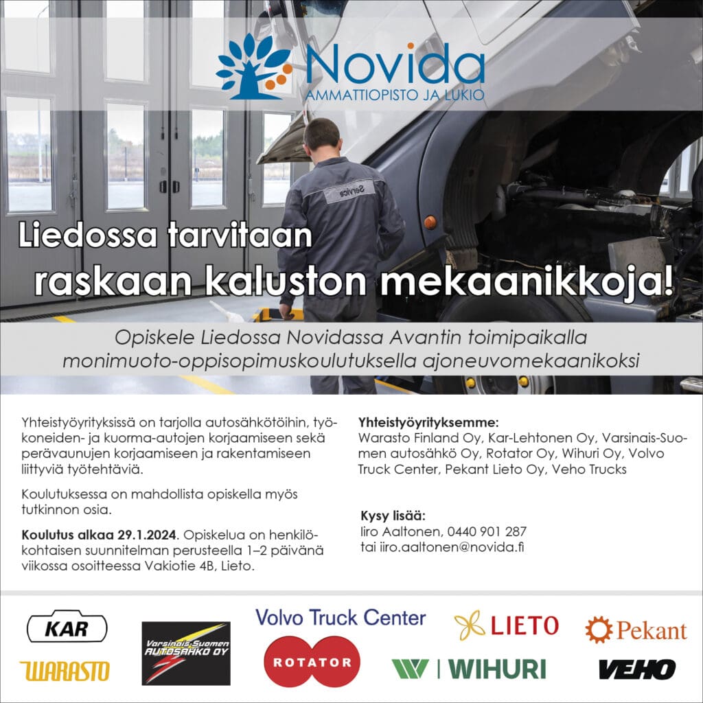 Novida on keväästä alkaen käynyt Liedon Avantin alueen yrittäjien ja Liedon kaupungin kanssa keskusteluja alueen yritysten tarpeista saada raskaankoneenasentajia palkkalistoilleen. Syksyllä keskusteluja on jatkettu ja yhteistä hyötyajoneuvomekaanikon koulutussuunnittelua konkretisoitu palaveri palaverilta sekä mm. käymällä kahdenkeskisiä kartoituskeskusteluja yritysten edustajien kanssa.