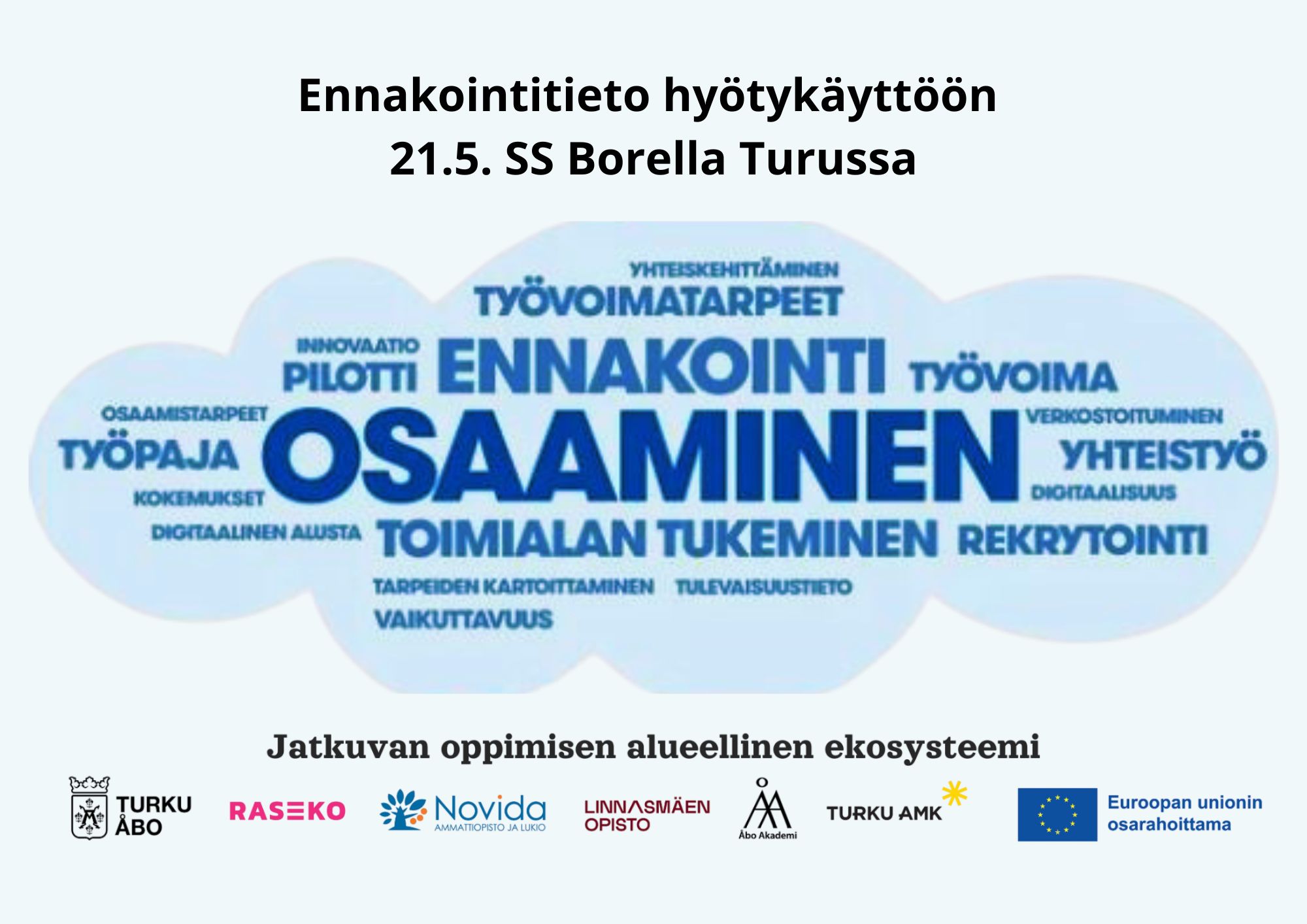 Jatkuvan oppimisen ekosysteemityön verkosto ja Varsinais-Suomen Ennakointiakatemia järjestävät lähitilaisuuden keskiviikkona 21.5 Turussa SS Borella Baltic-salissa klo 12.30 alkaen. Tilaisuuden keskeinen teema on ennakointitiedon hyötykäyttö erityisesti jatkuvan oppimisen palvelujen kehittämisen näkökulmasta ja lähestymme asiaa asiantuntijapuheenvuorojen ja esimerkkien sekä osallistavan keskustelun kautta. Kuulemme esimerkkejä mm. Liedosta ja Vantaalta sekä kauppakamarin toimintaan liittyen. Tilaisuus päättyy viimeistään 16.00.
