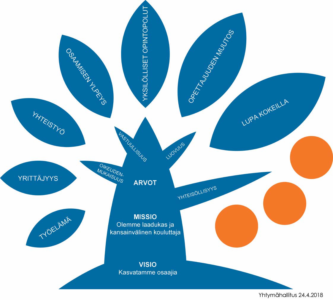 - Vastuullisuus – huolehdimme opetuksen, ohjauksen ja tukipalveluiden laadusta huomioimalla kestävän tulevaisuuden.