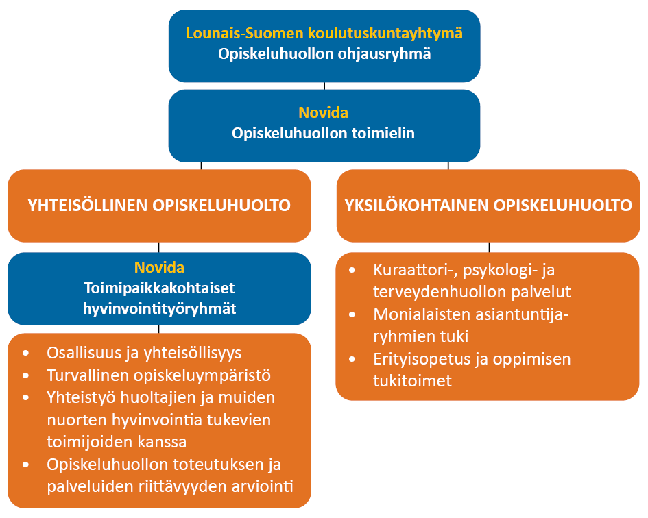 Novidan opiskeluhuoltotyötä (ks. kuva 1) ohjaa kuntayhtymän hallituksen asettama Lounais-Suomen koulutuskuntayhtymän opiskeluhuollon ohjausryhmä. Yhteisöllisen opiskeluhuollon koordinoinnista vastaa Novidan opiskeluhuoltoryhmä. Käytännön toteutuksesta vastaavat hyvinvointityöryhmät ja muu henkilökunta toimipisteittäin.