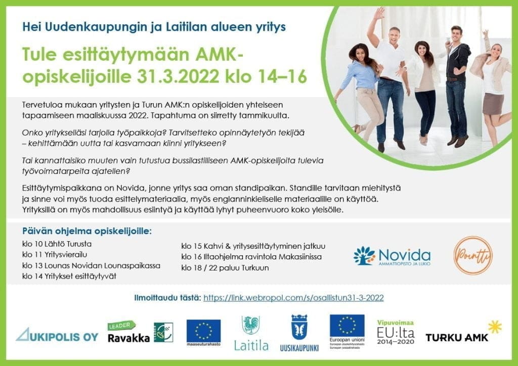 Linja-autollinen Turun AMK:n insinööri – ja tradenomiopiskelijoita on tulossa tutustumaan Uuteenkaupunkiin ja alueen tarjoamiin työmahdollisuuksiin torstaina 31.3.2022. Opiskelijat aloittavat päivänsä yritysvierailulla Vahteruksella. Yritykset esittäytyvät opiskelijoille Novidan B-rakennuksen aulassa klo 14–16. Mukaan on ilmoittautunut toistakymmentä yritystä mm. Valmet-Auotomotive, Yara, Vahterus, Ukitig, Munax, Osuuspankki, Coreplast ja Novoplastik.