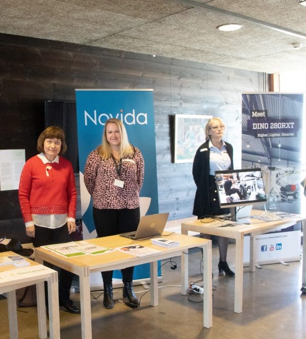 Novidan esittelypisteellä Anneli Frantti (vas.) ja Laura Kajander tarjoilivat koulutustietoa, viereisellä pisteellä on Dinoliftin henkilöstöpäällikkö Reija Högerman.