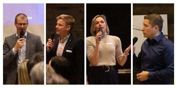 Kuvassa päivän puhujat: Pemamekin toimitusjohtaja Juha Mäkitalo (vas.), Loimaan kehitysjohtaja Paavo Laaksonen, Dinoliftin toimitusjohtaja Karin Nars sekä kiinteistömuotoilija Janne Rauhala, joka kartoittaa seutukunnan osaamis- ja työntekijätarvetta ja etsii yrityspuistoon sopivia (kumppani)yrityksiä.