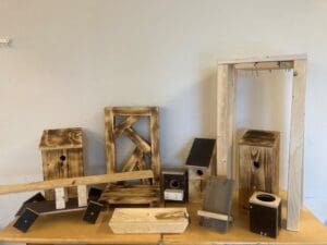 Rak22Uu-ryhmän omia luovia projekteja taide ja luovan ilmaisun tunnilta. Kuvassa linnunpönttöjä, voiveitsiä, kulhoja ja muuta taidetta.