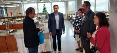 Uudenkaupungin kaupungin edustajat tervehtivät pitkäaikaista yhteistyökumppaniaan Juha Jokista.