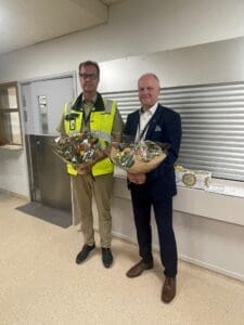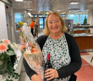 Mari Laihonen lähtee kukat ja eväät kainalossa viettämään ansaittua vapaata. Aktiivisia eläkepäiviä Marille toivottaa Novidan väki.
