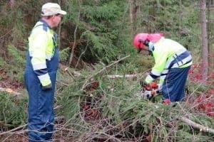 Ensimmäisen vuoden opiskelija Peppi Utriainen harjoittelee moottorisahan käyttöä koulutuspäällikkö Matti Ylösmäen opastuksessa.