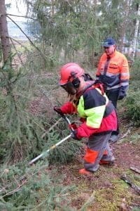Maatalousalan perustutkintoon kuuluu myös pienimuotoiset metsänhoidolliset tehtävät. Ensimmäisen vuoden opiskelija Reetta Turtiainen harjoittelee raivaussahan käyttöä lehtori Ari Ojalan opastuksessa.