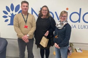 Norjalainen kv-koordinaattori Astrid Kristiansen (kesk.) vieraili viime viikolla Novidassa. Novidan kv-koordinaattori Josefiina Rausmaa (oik.) ja opettaja Petri Ulkuniemi esittelivät Astridille Novidan koulutusta.