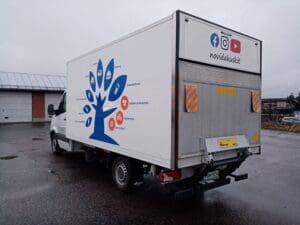 Uudenkaupungin logistiikka-alan Mercedes-Benz Sprinter -pakettiauto teipattiin koko toimipaikan aloja mainostaen.