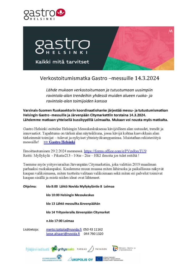 Varsinais-Suomen Ruokasektorin koordinaatiohanke järjestää messu- ja tutustumismatkan Helsingin Gastro -messuille ja Järvenpään Citymarkettiin torstaina 14.3.2024. Lähdemme matkaan yhteisellä bussikyydillä Loimaalta. Mukaan voi nousta myös matkalta.